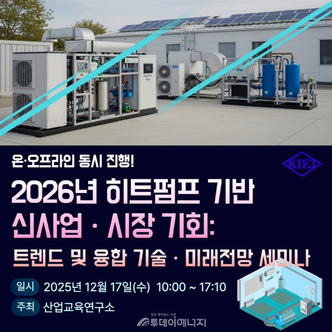 ![]() 세미나 이미지./산업교육연구소 제공 산업교육연구소는 오는 17일 ‘2026년 히트펌프 기반 신사업·시장 기회: 트렌드 및 융합 기술·미래전망 세미나’를 온·오프라인 동시 개최한다고 밝혔다. 이날 세미나 주제는 △히트펌프 국내외 시장 전망과 주요 국가의 활성화 정책 및 우리 기업의 대응전략 △제로의무화건축물에 따른 태양광·열복합(PVT) 모듈 소개와 히트펌프 융합 기술개발, 주요 이슈 및 경제성 분석 △친환경 냉매 물 기반 냉각·히트펌프 시스템 신기술 개발 △건물·주거용 히트펌프·HVAC와 전력관리의 에너지 최적 제어기술 및 적용 전략 △대형·산업용 고온 히트펌프 기술개발 동향과 실증사례 △데시컨트 하이브리드 히트펌프 기술 기반 제습냉방시스템 기술개발과 주요 이슈 및 상업화 △친환경 암모니아 히트펌프 기술과 전력 절감 효과 등이며, 오전 10시에 시작해 오후 5시 10분까지 발표된다. 산업교육연구소 관계자는 “이번 세미나가 기업의 신규 사업 발굴과 확장, 전략적 의사결정을 위한 실질적인 인사이트를 제공하는 자리가 되기를 기대한다”라며 “많은 관심과 참여 부탁드린다”고 말했다. 자세한 사항은 홈페이지(www.kiei.com) 또는 전화(02-2025-1333~7)로 문의하면 된다.