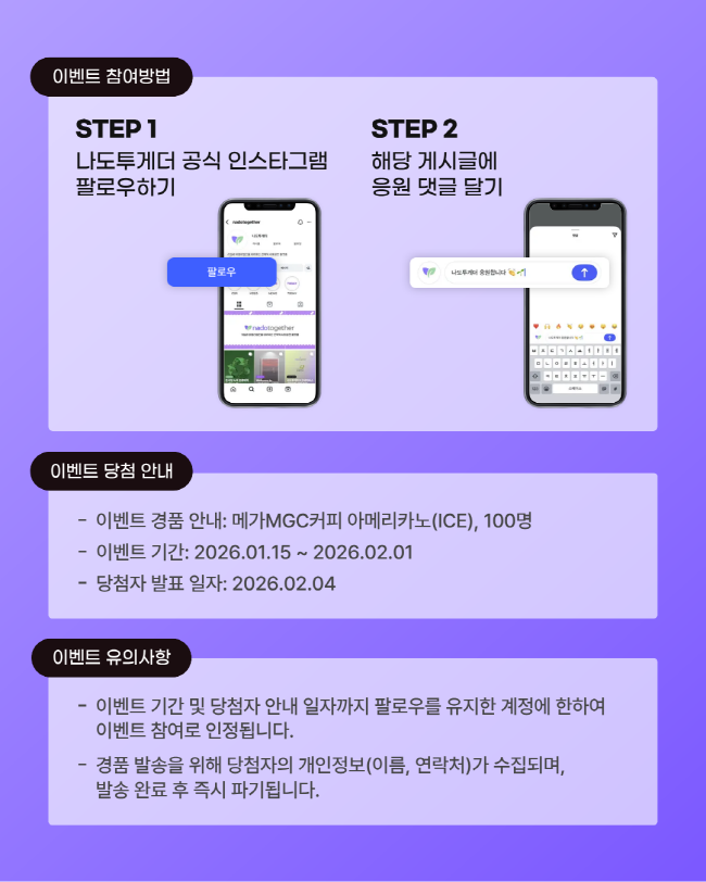 공식 인스타그램 계정을 팔로우하고, 응원 댓글을 남기시는 모두에게 메가커피 아이스 아메리카노 쿠폰을 드려요!