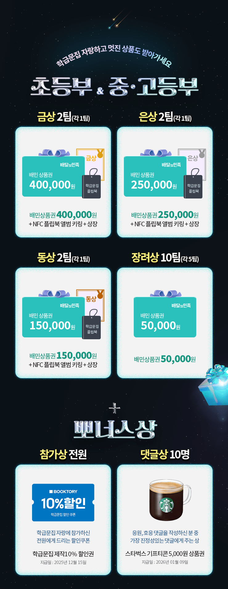 - 금상 ㅣ 2명 (각1팀) ㅣ배달의 민족 상품권 400,000원 + NFC 플립북 앨범 키링 + 상장