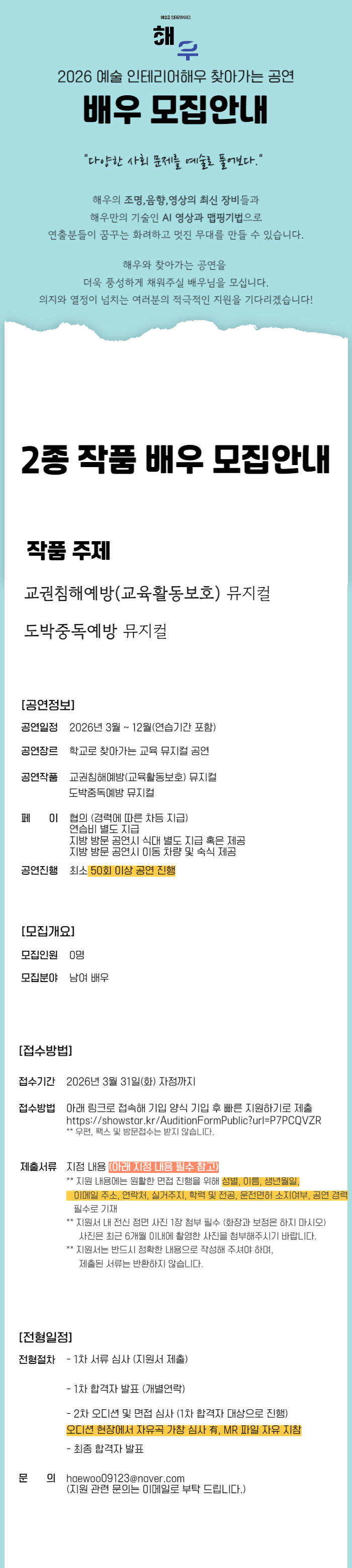 2026년 예술인테리어해우 찾아가는 뮤지컬 공연 작품 2종 전배역 모집