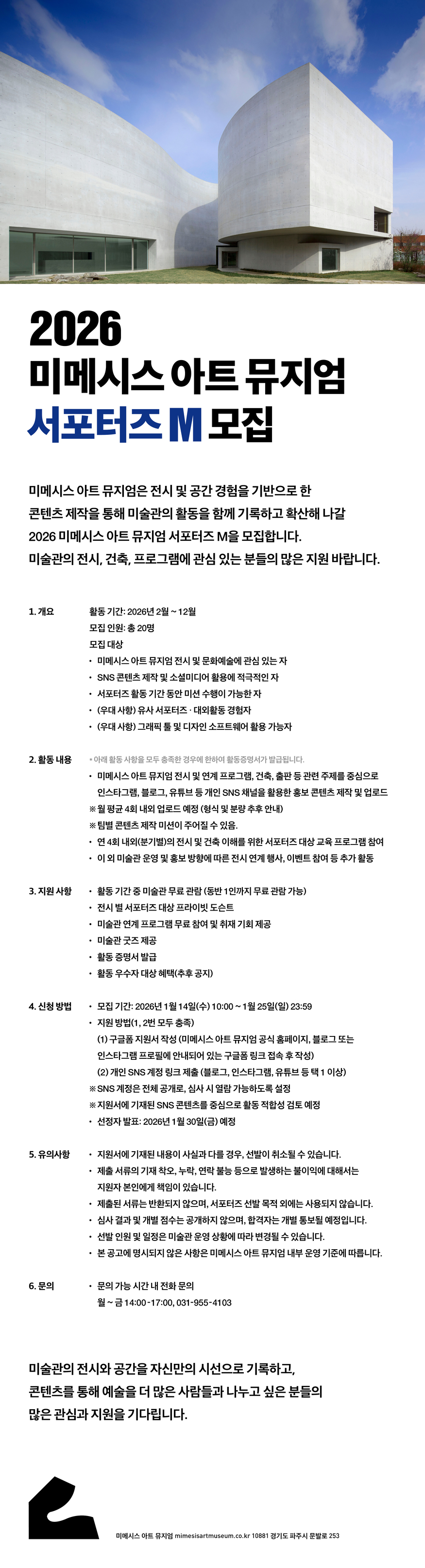 - 본 공고에 명시되지 않은 사항은 미메시스 아트 뮤지엄 내부 운영 기준에 따릅니다.
