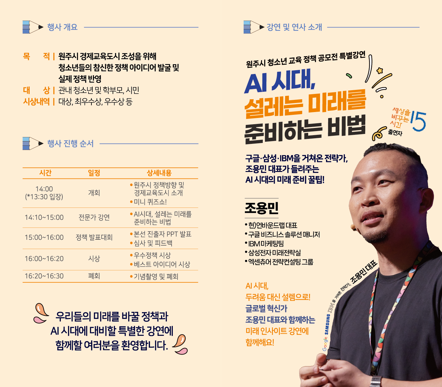 2025년 원주시 청소년 교육정책 발표대회와 함께하는 특별한 강연에 여러분을 초대합니다.