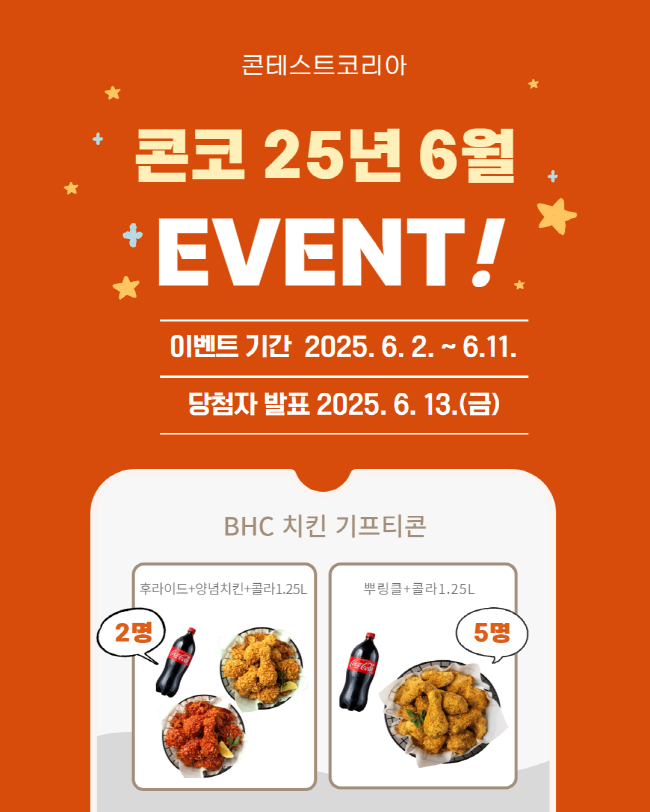 대 상 : 콘테스트코리아 개인 회원 (신규 가입 후 참여 가능) 일 정 : 2025.6. 2.(월) ~ 6.11.(수) 방 법 : 콘코 홈페이지 - 이벤트 - 콘코이벤트 (하단 '참여하기' 클릭! - 접수폼에 작성 접수) 경 품 : BHC 치킨 후라이드+양념치킨+콜라1.25L 기프티콘 (2명) BHC 치킨 뿌링클+콜라1.25L 세트 기프티콘 (5명) 발표일 : 6.13.(금) 콘코 홈페이지에 공지