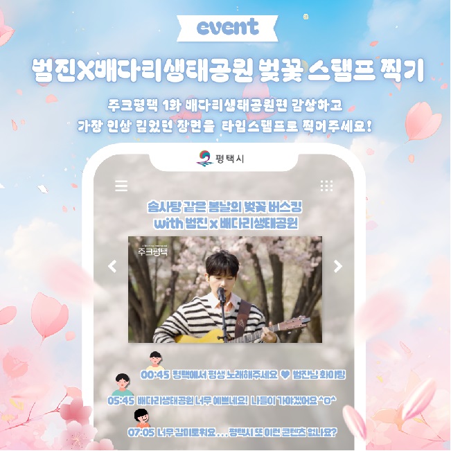 참여 방법 ① 평택시 유튜브 채널 구독 및 알람 설정 ② [주크평택] 솜사탕 같은 봄날의 벚꽃 버스킹 with 범진 x 배다리생태공원 영상 감상하기 영상 바로가기 : https://youtu.be/z_h8-RNpBOc?si=fSkVgXIE1zQwrzYS ③영상을 보다가 내 마음을 설레게 한 바로 그 장면의 시간을 확인하기 (EX 1분 30초 → 1:30) ️ ④ 총 3개의 타임스탬프를 찍고 그때 느꼈던 예쁜 마음을 댓글로 남기기 ️ (EX 1:30 벚꽃 배경이랑 아티스트와 찰떡이에요! 너무 예뻐요! 2:05 그림인 줄 알았어요️ 귀호강에 눈호강까지 감사합니다! 4:20 이 노래 들으니까 마음이 사르르 녹아요 멜로디가 벚꽃처럼 예쁘네요) ⑤ 구글폼 링크에 인증샷과 업로드 후 참가 신청 꾹