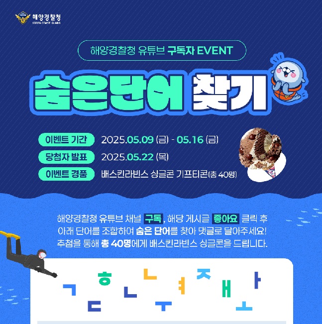 해양경찰청이 준비한 이벤트, 그 이름하여 <숨은 단어 찾기!> 정답을 맞추신 분들 중 추첨을 통해 총 40명(인스타그램+유튜브)에게 베스킨라빈스 싱글콘을 드립니다! 아치의 보너스 힌트 1: 자음, 모음의 색을 잘보고 조합해보면 정답이 나올지도~?! 아치의 보너스 힌트 2: 제주 바다를 누구보다 잘 아는 분들로 구성되어 해양경찰 구조활동에 도움주시는 단체에요! 과연, 센스좋고 눈치 빠른 단어 조합 최강자는 누구일까?! 이벤트 기간: 2025.05.09 (금) ~ 2025.05.16 (금) 참여 링크 : https://www.youtube.com/channel/UCl6GW0nhB6UIL05h2oF3vRA/community?lb=UgkxfdpzaHsUKL8hG3MBuv4gznDQR7NZMFFO 참여 방법 1. 해양경찰청 유튜브 구독 2. 해당 커뮤니티 게시물 좋아요 클릭 3. 힌트 확인 후 정답 댓글로 작성 당첨자 발표: 2025.05.22 (목) 해양경찰 커뮤니티 게시글 안내 현 이벤트는 해양경찰청 SNS(인스타그램, 유튜브)에 동시 진행하는 이벤트로써 중복 참여는 가능하나 중복 당첨은 불가합니다. 본 이벤트는 추첨을 통해 상품을 지급하여 만일 중복 당첨이 된 경우 하나의 상품만 제공하며 잔여 상품은 재추첨으로 진행합니다. 상품이 발송된 후 유효기간 이내 사용해야 하며 유효기간 만료 후 연장 및 환불은 불가합니다. 팔로우 인증이 어려울 시 당첨이 취소될 수 있습니다. 당첨자분들은 추후에 당첨발표 될 게시물에 적힌 구글폼을 작성해주셔야하며, 기간 내 미작성 시 상품 수령이 어렵습니다.