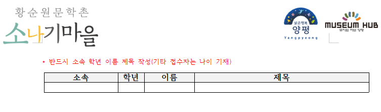 "제21회 황순원문학제 온라인 백일장"에 관심 가져주셔서 감사합니다.문의하신 내용에 답변드립니다.>> 신청서 다음 장에 같이 작성해서 첨부해주셔야 합니다. 'sonagivillage@daum.net' 메일로 성함과 작성하신 글 보내주시면 접수해드리겠습니다. 감사합니다.- "제21회 황순원문학제 온라인 백일장" 담당자 드림 -