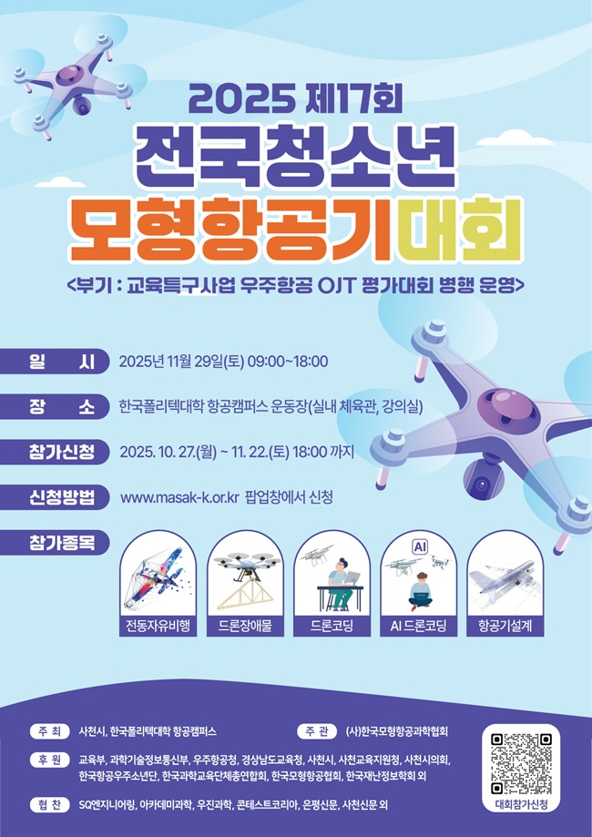한국폴리텍대학 항공캠퍼스는 최근 오는 11월 29일 토요일 오전 8시30분부터 오후 6시까지 한국폴리텍대학 항공캠퍼스운동장(실내체육관)에서 전국 초·중·고등학생 및 청소년을 대상으로 ‘2025년 제17회 전국청소년모형항공기대회’를 개최한다고 밝혔다. 이번에 개최되는 행사에는 총 참가부문 5개부문에 걸쳐 진행되며 실외 종목 전동자유비행기 부문을 포함해 실내 4종목(드론장애물부문, 드론코딩부문, AI드론코딩부문, 항공기설계 부문) 등 5개부문 6개부, 600명 내외의 학생들이 참여하는 것으로 알려졌다. 주최와 주관은 한국폴리텍대학 항공캠퍼스와 한국모형항공과학협회가 각각 맡았으며 이번 행사는 국내 유일의 초·중·고등학생 및 일반인 대상의 모형항공기 대회로 전동자유비행부문, 드론장애물부문, AI드론코딩부문, 드론코딩부문, 항공기설계부문으로 세분화하여, 자라나는 미래의 과학 인재들에게 항공 우주과학에 대한 비전과 가치를 제시하고 탐구 활동을 통해 창의성 고취의 기회를 제공함으로 청소년들의 꿈과 끼를 펼칠 수 있는 행사를 개최함을 목적으로 하고 있다고 설명한다. 이번 행사의 후원은 사천신문(주)을 비롯해 사천시, 교육부, 과학기술정보통신부, 우주항공청, 경상남도, 경상남도교육청, 사천시교육지원청, 한국항공우주소년단, 한국과학교육단체총연합회, 한국모형항공협회, 한국재난안전협회 등이 맡았다. 또 협찬에는 SQ엔지니어링, 아카데미과학, 우진과학, 콘테스트코리아, 은평신문 등이 이름을 올렸다. 안전관리에는 경찰과 소방, 보건(구급차) 등 지역의 단체들이 합심하여 사천에서 치러지는 최초의 행사에 협력하고 있다. |