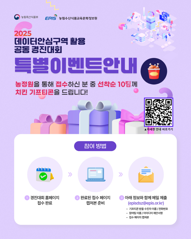 이벤트 2. 경진대회 접수 선착순 이벤트 농정원을 통해 경진대회에 접수하신 분 중 선착순 10팀께는 치킨 기프티콘을 드립니다!