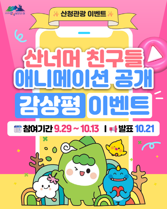 [참여방법] 1) @산청여행 유튜브 구독 https://www.youtube.com/@%EC%82%B0%EC%B2%AD%EC%97%AC%ED%96%89 2) 산너머 친구들 애니메이션 7편 감상하고 댓글 남긴 후 좋아요 꾸욱! https://www.youtube.com/watch?v=EvTX0tFBFlw&list=PLVd1YllmLrRLUa0mBPMeN4e4-QjZITZRr