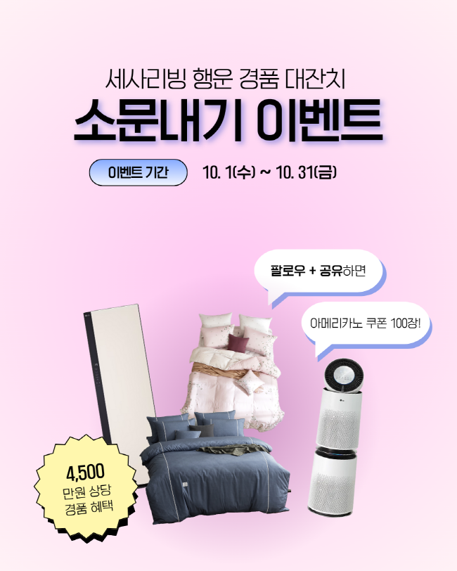 #스타일러 #공기청정기 #구스이불 등 총 4,500만 원어치의 프리미엄 경품을 받을 수 있는 세사리빙 행운 경품 대잔치 소문내기 이벤트