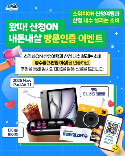 ※ 이벤트 참여 주의 사항 ※ 상위 경품 당첨 시, 하위 경품 추첨에서 제외 본 이벤트는 산청관광 공식 SNS 채널에서만 진행되며, 중복 참여 불가 실물 경품 당첨자는 개별 연락 후 제세공과금 22% 납부 후 배송 진행 이벤트 기간 산청ON, 내수 소비 인증 영수증만 인정되며, 영수증 별도 제출시 날짜·승인번호 등이 포함된 전체 이미지 제출 불명확한 인증 또는 영수증 미인증시 추첨에서 제외 5만 원 초과 경품은 제세공과금(22%) 본인 부담 경품 및 이벤트 내용은 내부 사정에 따라 변경될 수 있음 비정상적인 참여(다중 계정, 부정 응모 등) 적발 시 당첨이 취소될 수 있음 개인정보 오기재로 인한 불이익(상품 미발송 등)은 본인 책임 개인정보는 경품 발송 종료 후 6개월 이내 파기 산&청 미션 인증시 당첨자 선정 기준 1) 게시물 정성도(글/사진 구성, 방문 인증) 2) 콘텐츠 노출 및 반응률(좋아요, 댓글 등 소통지수) |