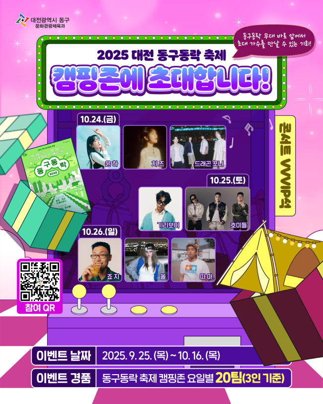 ️이벤트 날짜 : 2025.9.25.(목) ~ 10.16.(목) 당첨자 발표 : 1일차 10.20.(월) ㅣ 2일차 10.21.(화) ㅣ 3일차 10.22.(수) 이벤트 경품 : 동구동락 축제 캠핑존 요일별 20팀(3인 기준)