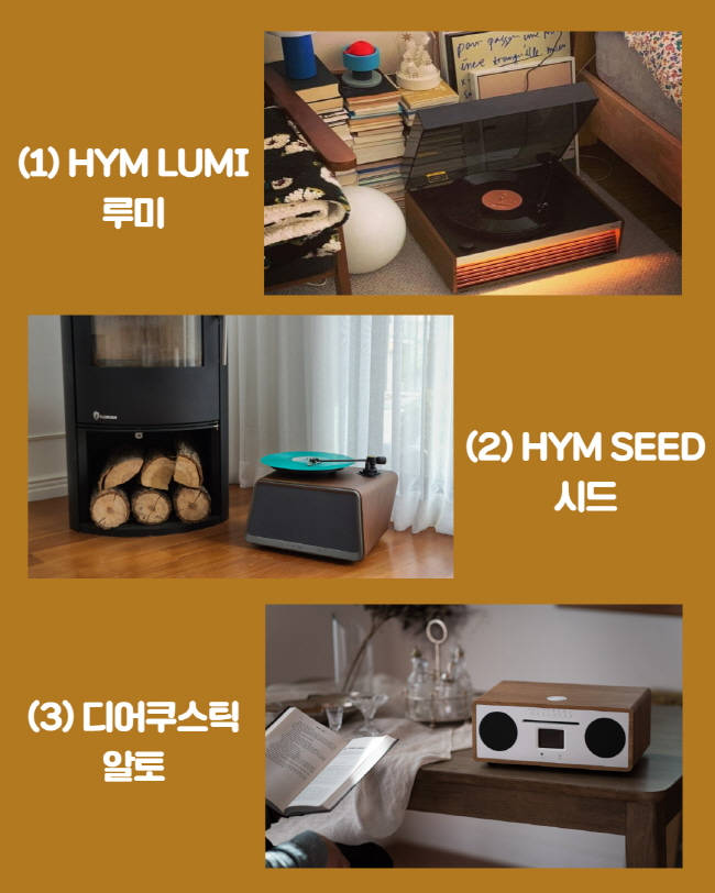 HYM 루미 – 조명과 LP 사운드가 어우러진 감성 턴테이블 HYM 시드 – LP 감성과 현대 음질을 함께 즐기는 올인원 스피커 디어쿠스틱 알토 – 우드 컬러의 클래식한 미니 오디오