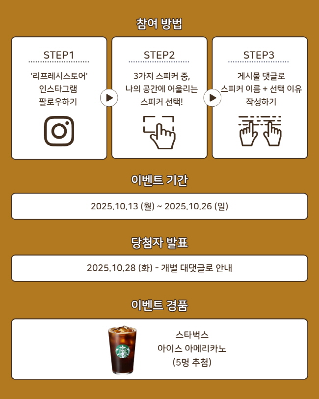 나의 인테리어에 찰떡인 스피커를 골라 댓글로 남겨주시면, 추첨을 통해 스타벅스 아이스 아메리카노를 드립니다!