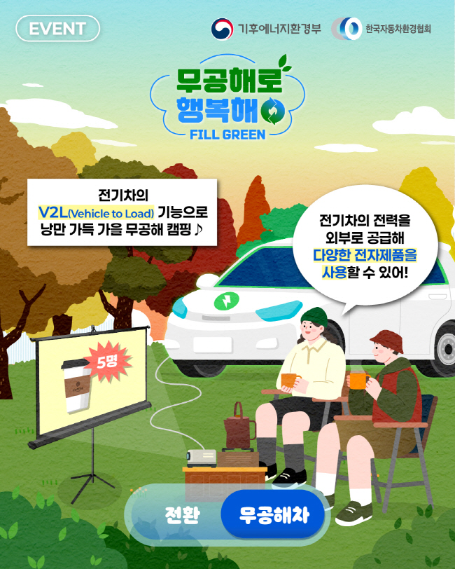 전기차의 전력을 외부로 공급할 수 있는 V2L(Vehicle to Load) 기능을 활용해 낭만 가능한 가을 무공해 캠핑을 즐겨보세요
