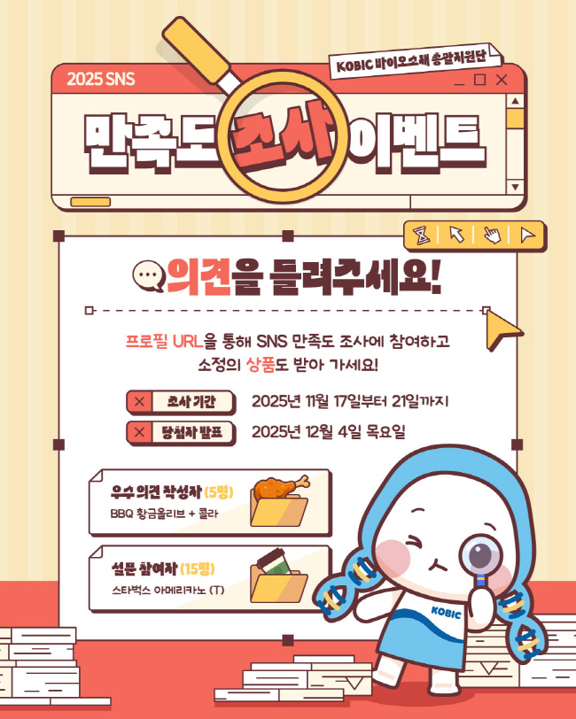 ![]() 2025년 KOBIC 인스타그램 만족도 조사를 실시합니다. 많은 관심과 참여 부탁드립니다. 참여 방법 프로필 링크 → 2025년 KOBIC SNS 만족도 조사 클릭 Tip : KOBIC SNS 채널에 대한 의견을 구체적으로 작성하면 당첨 확률 Up 조사 기간 2025년 11월 17일~21일까지 당첨자 발표 2025년 12월 4일 목요일 경품 우수 의견 작성자 : BBQ 황금올리브+콜라 (5명) 설문 참여자 : 스타벅스 아메리카노T (15명)