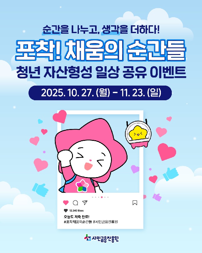 ![]() <포착! 채움의 순간들> 청년 자산형성 일상 공유 이벤트! 안녕! 도약이들~ 도약이들을 위해서 채우미가 특급 이벤트를 낋여와따! 도약이들의 일상 속 절약·저축 혹은 금융생활의 순간을 포착해봐! 사진이나 영상으로 공유하면 푸짐한 경품의 주인공이 될 수도 있다구! 지금 바로 참여하러 가볼까? * 응모 일정 10월 27일(월) ~ 11월 23일(일) 23:59까지 결과 발표 12월 8일(월) 이벤트 주제 나(청년)의 일상 속 저축·절약, 금융생활의 순간 이벤트 응모 대상 저축·절약 및 금융생활을 하는 19~34세 청년 누구나 경품 내용 -1등: 애플워치 11(1명) -2등: 에어팟3 프로(1명) -3등: 모바일 신세계 상품권 10만원 권(2명) -참가상: 배달의 민족 상품권 1만원 권(50명) ※5만원 이상의 경품에 대한 제세공과금은 수상자 본인 부담 ※작품 접수 및 심사 결과에 따라 경품 내용은 변동될 수 있음 참여 방법 ① 내 일상 속 절약 · 저축 및 금융생활의 순간을 포착하여 사진 혹은 영상으로 남긴다. ② 청년 자산형성에 대한 다짐 한 마디와 함께 게시물을 업로드 한다. * 해시태그(#포착채움의순간들 #서민금융진흥원) 및 계정 태그(ylaccount.official) 필수 ③ 응모 구글 폼을 통해 서민금융진흥원 청년 자산형성 지원 정책(청년도약계좌, 청년금융 컨설팅)에 대해 전하고 싶은 메시지를 적는다. ④ 계정명, 게시물 업로드 링크와 함께 제출하면 끝! *응모 폼 링크는 제일 마지막장 QR코드 혹은 인스타그램 프로필 링크트리에서 확인할 수 있어! 이벤트 참여 TIP ① 영상으로 업로드 시 눈길을 끌 확률이 더 높다구~ ② 청년 자산형성 지원 정책에 대해 전하고 싶은 메시지는 진심이 담길 수록 굿~! 유의사항 ※ 참여방법을 충족한 분(계정태그 및 해시태그 포함, 게시물 전체공개)에 한해 이벤트에 정상적으로 응모됩니다. ※ 중복 응모가 가능하나, 중복 수상 및 당첨은 불가능합니다. ※ 본인이 제작한 순수 창작물로만 응모 가능하며, 타 공모 및 이벤트 수상작, 타인의 저작물, 명의도용, 생성형 AI 활용 프로그램 및 사이트로 제작한 작품 등의 경우 응모가 취소되고, 이벤트 수상·당첨 후에도 당첨을 취소하고 경품을 환수할 수 있습니다. ※ 참여자에 대한 저작권, 초상권, 명예훼손 등 분쟁에 따른 민·형사상의 법적 책임은 이벤트 참여자 본인에게 있습니다. ※ 1~3등 수상작은 추후 원본을 제출해야 하며, 제출된 참여작은 반환하지 않습니다. 또한, 주최기관의 홍보물(홍보를 위한 2차적 저작물, 편집 저작물 작성 및 이용권 포함)로 활용할 수 있습니다. ※ 이벤트 응모 결과에 따라 당첨인원과 경품을 포함한 이벤트 내용은 축소되거나 변동될 수 있습니다. ※ 5만원 이상 경품지급에 따른 제세공과금은 1~3등 수상자 본인이 부담합니다. ※ 1~3등 수상자 및 당첨자에게는 결과 발표 후 경품 발송을 위한 개인정보를 별도로 수집하며, 이에 동의하지 않거나 3일 이내 개인정보 수집 폼 미작성 시 이벤트 수상·당첨이 취소됩니다. ※ 유의사항 미숙지로 인하여 발생하는 모든 문제에 대한 책임은 참여자 본인에게 있습니다.