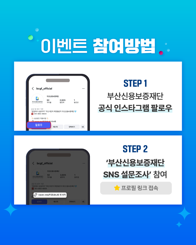 참여 방법 ① @bcgf_official 팔로우 ② 프로필 링크 클릭 → ‘부산신용보증재단 SNS 설문조사’ 참여