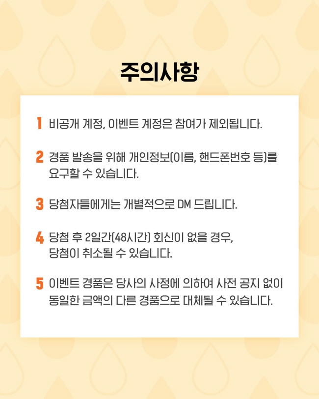 ️ 주의사항 - 비공개 계정 및 이벤트 계정은 참여에서 제외됩니다. - 경품 발송을 위해 개인정보(이름, 핸드폰번호 등)를 요청할 수 있습니다. - 당첨자에게는 개별 DM을 보내드립니다. - 당첨 후 2일(48시간) 내 회신이 없을 경우, 당첨이 취소될 수 있습니다. - 이벤트 경품은 당사의 사정에 의하여 사전 공지 없이 동일한 금액의 다른 경품으로 대체될 수 있습니다.