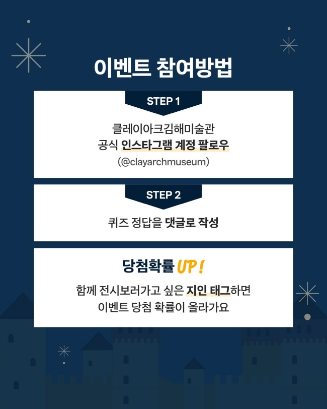 이벤트 참여 방법 ① 클레이아크김해미술관 공식 인스타그램 팔로우 ② 퀴즈 정답을 댓글로 달기