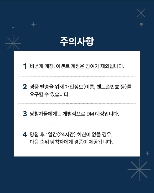 유의사항 - 비공개 계정 및 이벤트 참여용 계정은 당첨에서 제외됩니다. - 경품 발송을 위해 개인정보(이름, 휴대폰 번호 등)를 요청드릴 수 있습니다. - 당첨자에게는 개별 DM이 발송됩니다. - 당첨 후 24시간 이내 회신이 없을 경우, 다음 순위 당첨자에게 경품이 제공됩니다. |