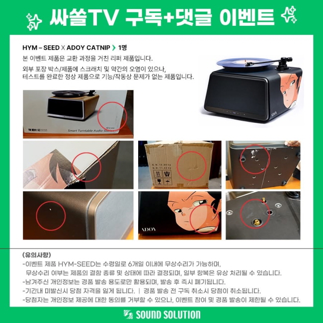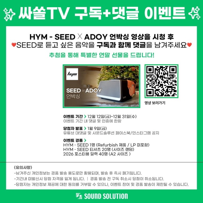 HYM - SEED X ADOY 언박싱 영상을 시청 후 SEED로 듣고 싶은 음악을 구독과 함께 댓글을 남겨주세요. 추첨을 통해 특별한 연말 선물을 드립니다! - 이벤트 기간 > 12월 12일(금)~12월 31일(수) 이벤트 기간 내 댓글 및 인증에 한함 당첨자 발표 >1월 9일(금) 유튜브 대댓글 및 사운드솔루션 페이스북/인스타그램 공지 당첨자 연락 회신 기간 > 1월 9일(금)~1월 19일(월) 이벤트 경품 HYM – SEED 1명 (Refurbish 제품 / LP 미포함) / HYM – SEED 티셔츠 20명(사이즈 랜덤) / Hi-Fi+Consumer 2026 포스터용 달력 40명 (A2 사이즈) / - HYM – SEED X ADOY 보러가기 https://smartstore.naver.com/soundhub/products/5826621047 HYM – SEED 오리지널 보러가기 https://smartstore.naver.com/soundhub/products/5060657280 - ️유의사항 -이벤트 제품 HYM-SEED는 교환 과정을 거친 리퍼 제품입니다. 외부 포장 박스/제품에 스크래치 및 약간의 오염이 있으나, 테스트를 완료한 정상 제품으로 기능/작동상 문제가 없는 제품입니다. 수령일로 6개일 이내에 무상수리가 가능하며, 무상수리 여부는 제품의 결함 종류 및 상태에 따라 결정되며, 일부 항복은 유상 처리될 수 있습니다. -남겨주신 개인정보는 경품 발송 용도로만 활용되며, 발송 후 즉시 폐기됩니다. -기간내 미발신시 당첨 자격을 잃게 됩니다. -경품 발송 전 구독 취소시 당첨이 취소됩니다. -당첨자는 개인정보 제공에 대한 동의를 거부할 수 있으나, 이벤트 참여 및 경품 발송이 제한될 수 있습니다. ㅡ