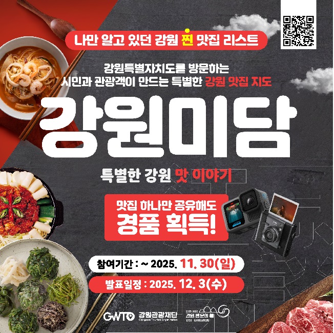 ![]() 2025 강원미식 50선 : 강원미담 강원특별자치도를 방문하는 시민과 관광객이 만드는 특별한 강원 맛집 지도, 강원미담️ 나만 알고 있던 강원 ’찐‘ 맛집 리스트 하나만 공유해도 경품 획득 참여기간 : ~ 2025. 11. 30(일) 발표일정 : 2025. 12. 3(수) *개별 연락 예정 참여방법 ① 카드뉴스 이미지에 QR코드를 스캔 또는 홈페이지 URL(https://gwfr.kr)에 접속 ② 나의 맛집 신청하기 버튼 클릭 ③ 신청폼을 작성한 뒤 '제출' 버튼을 클릭하면 신청 완료! 지금, 당신의 강원 맛집을 알려주세요!