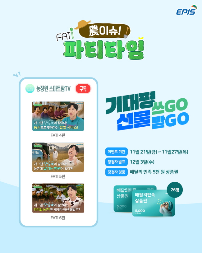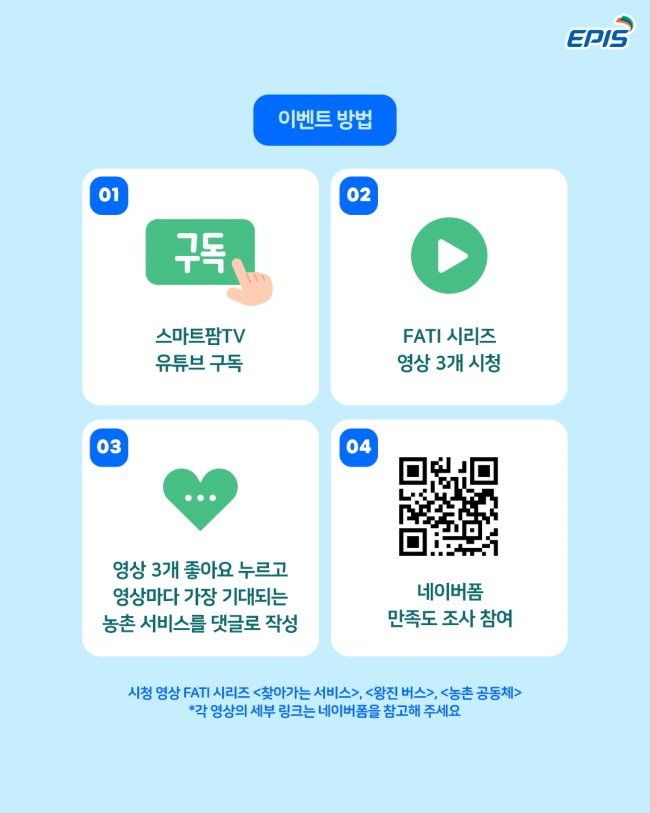 참여 방법 1️⃣ 스마트팜TV 유튜브 채널 구독 2️⃣ FATI 시리즈 영상 3편 시청 3️⃣ 각 영상에 좋아요 + 댓글 작성 4️⃣ 아래 링크에서 네이버폼 만족도 조사 참여 https://naver.me/xGFC2qLL