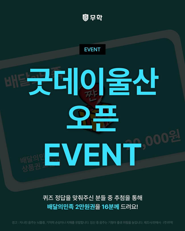️ 주의사항 1. 비공개 계정, 이벤트 계정은 참여가 제외됩니다. 2. 경품 발송을 위해 개인정보(이름, 핸드폰 번호 등)을 요구할 수 있습니다. 3. 당첨자에게는 개별적으로 DM을 보내드립니다. 4. 본 이벤트는 성인만 참여 가능합니다. 5. 과도한 음주 또는 음주 미화성 표현은 제외될 수 있습니다. 6. 이벤트 경품은 당사의 사정에 의하여 사전 공지 없이 동일한 금액의 다른 경품으로 대체될 수 있습니다. |