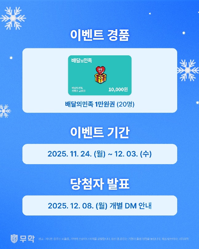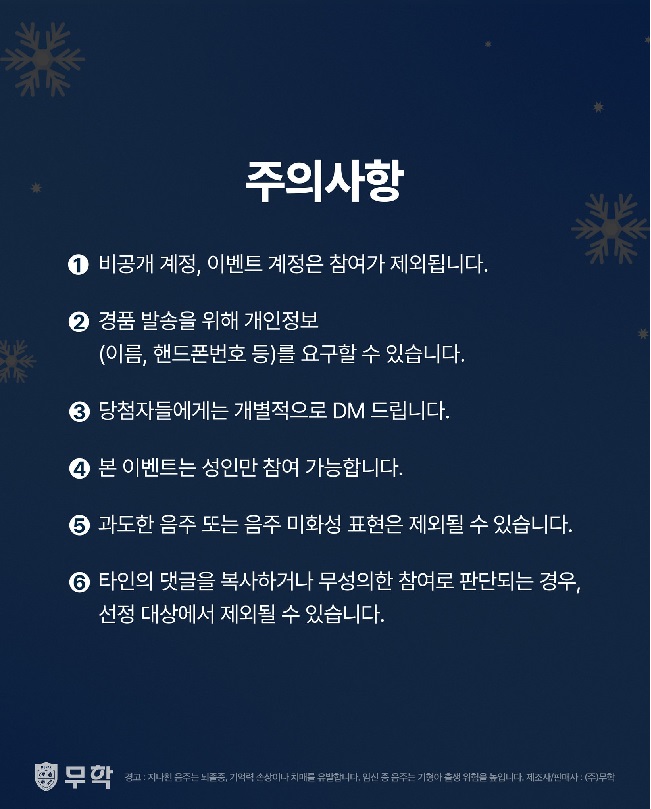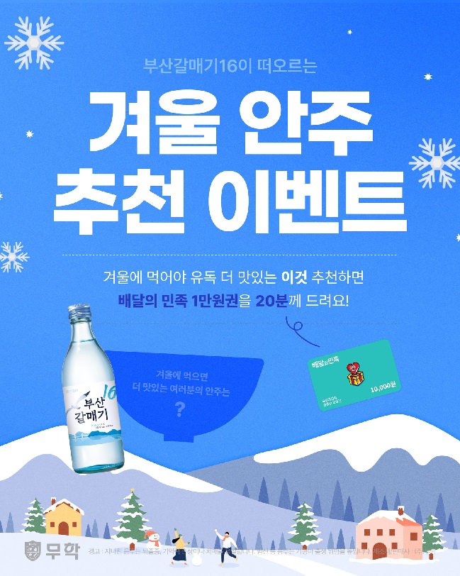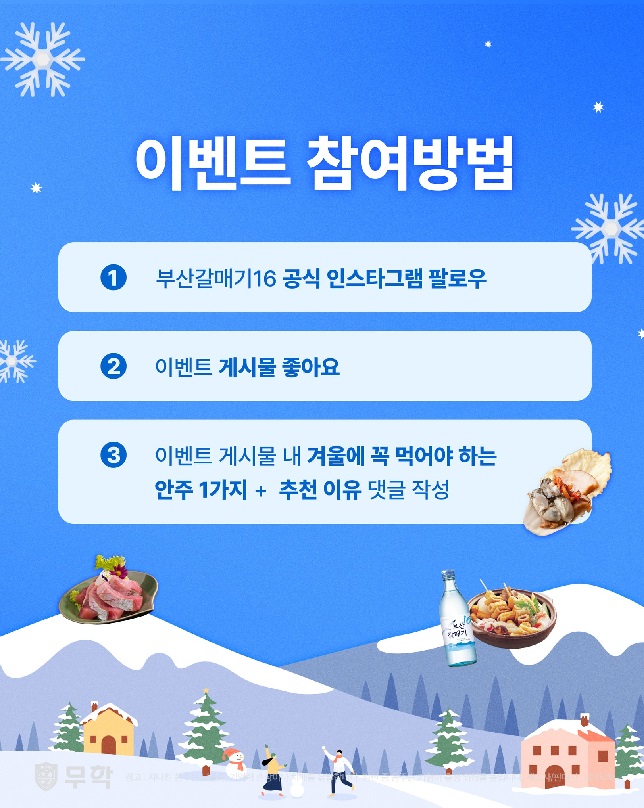 ![]() ![]() ![]() ![]() ![]() ![]() 이벤트 #EVENT 부산갈매기16이 떠오르는 겨울 안주 추천 이벤트 찬바람으로 불면 자동으로 떠오르는 그 메뉴, 여러분은 뭐가 제일 먼저 생각나세요? 부산갈매기16이 떠오르는 겨울 안주 1가지 + 추천 이유 한 줄 댓글로 알려주세요! 이벤트 참여 방법 ① 부산갈매기16 공식 인스타그램 팔로우 ② 이벤트 게시물 좋아요 ③ 이벤트 게시물 내 겨울철 안주 추천 댓글 달기 이벤트 경품 배달의민족 1만원권 (20명) 이벤트 기간 2025.11.24.(월) ~ 12.03.(수) 당첨자 발표 2025.12.08.(월) 인스타그램 스토리를 통해 발표 후 개별 DM 예정 주의사항 - 비공개 계정 및 이벤트 계정은 참여에서 제외됩니다. - 경품 발송을 위해 개인정보(이름, 휴대폰 번호 등)를 요청할 수 있습니다. - 당첨자에게는 개별 DM을 보내드립니다. - 당첨 후 2일(48시간) 내 회신이 없을 경우, 당첨이 취소될 수 있습니다. - 본 이벤트는 성인만 참여 가능합니다. - 과도한 음주 또는 음주 미화성 표현은 제외될 수 있습니다. - 타인의 댓글을 복사하거나 무성의한 참여로 판단되는 경우, 선정 대상에서 제외될 수 있습니다.