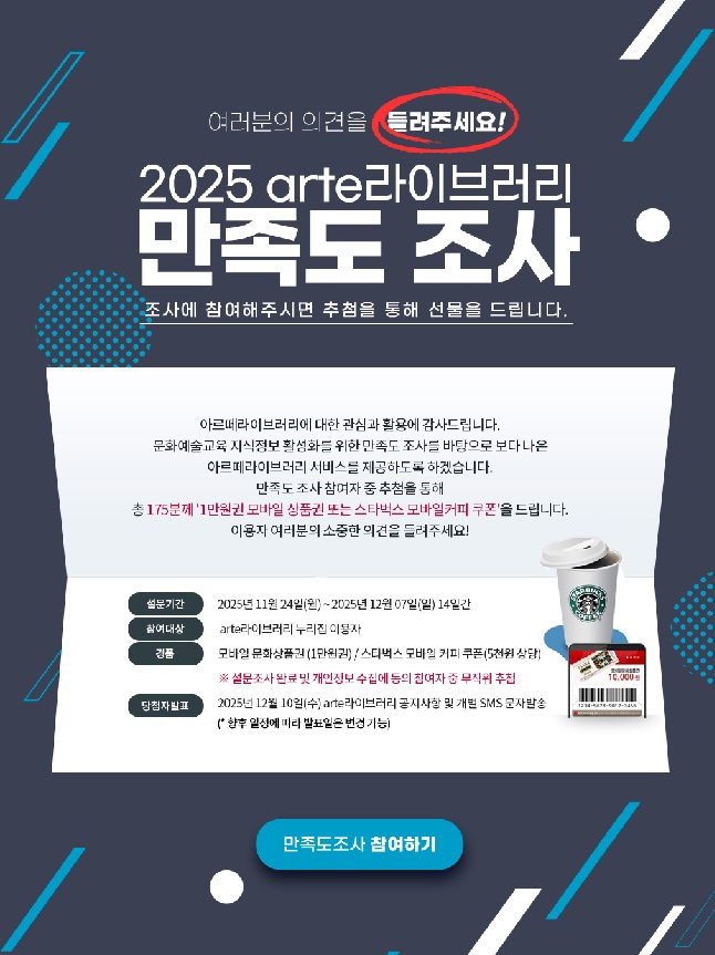 ![]() 2025 arte라이브러리 만족도 조사 아르떼라이브러리에 대한 관심과 활용에 감사드립니다. 문화예술교육 지식정보 활성화를 위한 만족도 조사를 바탕으로 보다 나은 아르떼라이브러리 서비스를 제공하도록 하겠습니다. 만족도 조사 참여자 중 추첨을 통해 총 175분께 '1만원권 모바일 상품권 또는 스타벅스 모바일커피 쿠폰'을 드립니다. 이용자 여러분의 소중한 의견을 들려주세요! 참여기간 : 2025년 11월 24일(월) ~ 12월 07일(일) 경품 : 1만원권 모바일 상품권 또는 스타벅스 모바일커피 쿠폰 당첨자 발표 : 2025년 11월 18일(화)
