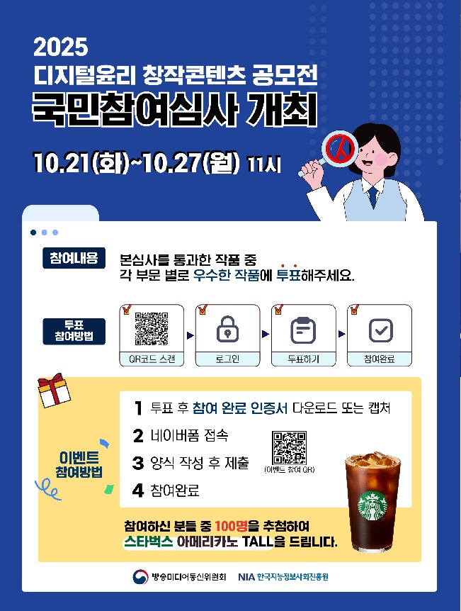 ![]() 안녕하세요. 한국지능정보사회진흥원입니다. 방송미디어통신위원회가 주최하고 한국지능정보사회진흥원이 주관하는 '2025년 디지털윤리 창작콘텐츠 공모전' 국민참여심사 안내드립니다. 본 공모전은 창작콘텐츠 기획·제작 과정을 통해 전 국민의 디지털윤리 의식을 확산하고 국민 관점의 디지털윤리 인식제고 및 교육 콘텐츠를 발굴하기 위한 공모전입니다. ‘2025년 디지털윤리 창작콘텐츠 공모전’ 수상자 선정을 위하여 온라인 국민투표를 아래와 같이 진행하오니 많은 관심과 참여 부탁드립니다. < 2025년 디지털윤리 창작콘텐츠 공모전 국민참여심사 개요 > o 심사대상 : 대상별(초중고, 성인, 군장병, 교사 및 예비교사) 디지털 윤리 인식제고/학습 콘텐츠 - 인식제고 콘텐츠 : 그림일기, 포스터, 카드뉴스, 웹툰, 동영상 - 학습 콘텐츠 : 교수‧학습지도안 o 심사기간 : '25.10.21.(화) 17:00 ~ 10.27.(월) 11:00 o 심사방법 : 대상별 우수 콘텐츠 투표(대상별 1작품 투표 필수) ※ 국민심사 진행시, 포스터/카드뉴스 등 이미지 파일이 작게 보일 시 해당 이미지 오른쪽 상단 돋보기 버튼을 클릭하시면 적절한 크기의 이미지로 조정하여 보실 수 있습니다. o 심사링크 : https://www.cheesebutton.io/vote/issue-election/68f5c38f7e9bc573d749e212/intro?utm_source=share_link&utm_medium=referral o 문의 : (유선전화) 010-9012-1143 / (카카오톡채널) 디지털윤리 창작콘텐츠 공모전 공정하고 객관적인 심사가 이루어질 수 있도록, 작품의 완성도와 주제 적합성을 기준으로 신중하게 참여해주시기 바라며, 이벤트 참여 폼에 "참여 완료 인증서"를 업로드하면, 추첨을 통해 100명에게 스타벅스 아이스 아메리카노를 드립니다. 감사합니다.