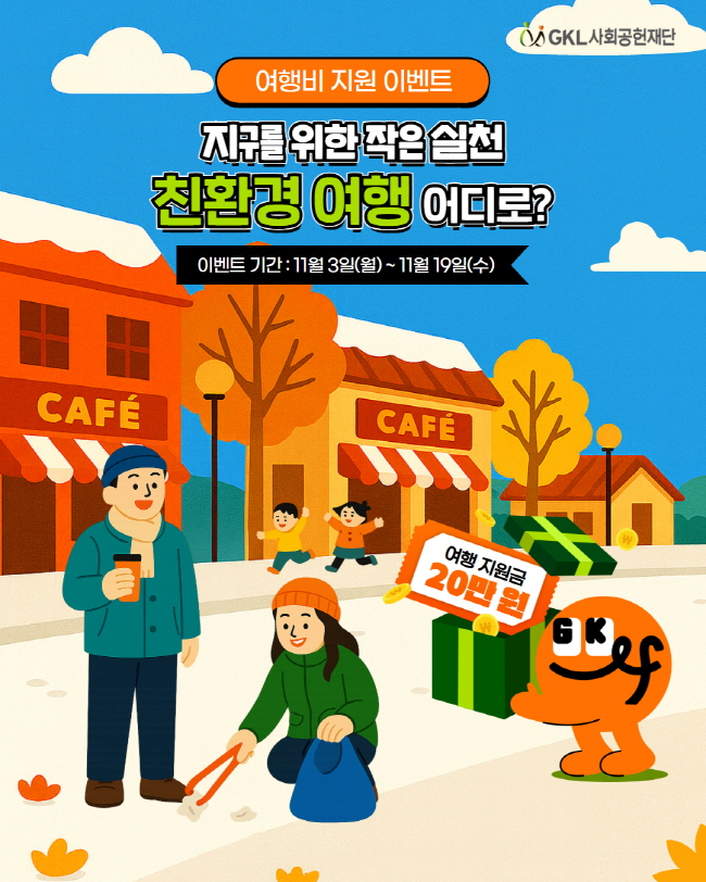 [여행비 지원 이벤트] ️기간 : 2025년 11월 3일(월) ~ 11월 19일(수) ️당첨자 발표 : 2025년 11월 24일(월) *댓글로 발표 후 개별 연락 ※11월 21일~23일 사이, 1등 후보로 선정된 분께 확인 DM을 드릴 예정입니다. 기간 내 회신 주셔야 당첨이 확정되므로, 이벤트 종료 후 DM을 꼭 확인해 주세요. ️참여 방법 Step 1. GKL 사회공헌재단 SNS 채널 팔로우 Step 2. 댓글로 친환경 여행 습관과 여행을 떠나고 싶은 사연을 남기면 응모 완료! TIP) 본 게시글을 개인 SNS로 공유하면 당첨 확률 UP!