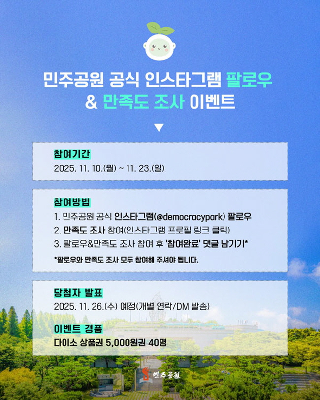 1️⃣ 민주공원 공식 인스타그램 (@democracypark) 계정을 팔로우하고 구글 폼에 인증사진을 첨부해 주세요. 2️⃣ 민주공원 홍보 채널 및 콘텐츠 만족도 조사(본 구글 폼)에 참여해 주세요. 3️⃣ 인스타그램 이벤트 안내 게시글에 ‘참여완료’ 댓글을 남겨주세요. 4️⃣ 추첨을 통해 선정된 분들께 개별 연락을 드립니다. |