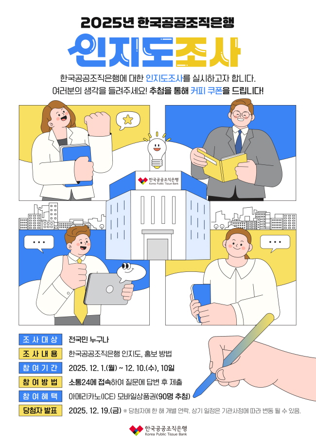 조사내용 : 한국공공조직은행 인지도, 홍보 방법 참여기간 : 2025. 12. 1.(월) ~ 12. 10.(수), 10일 참여방법 : 소통24에 접속하여 질문에 답변 후 제출 참여혜택 : 아메리카노(ICE) 모바일상품권(90명 추첨)