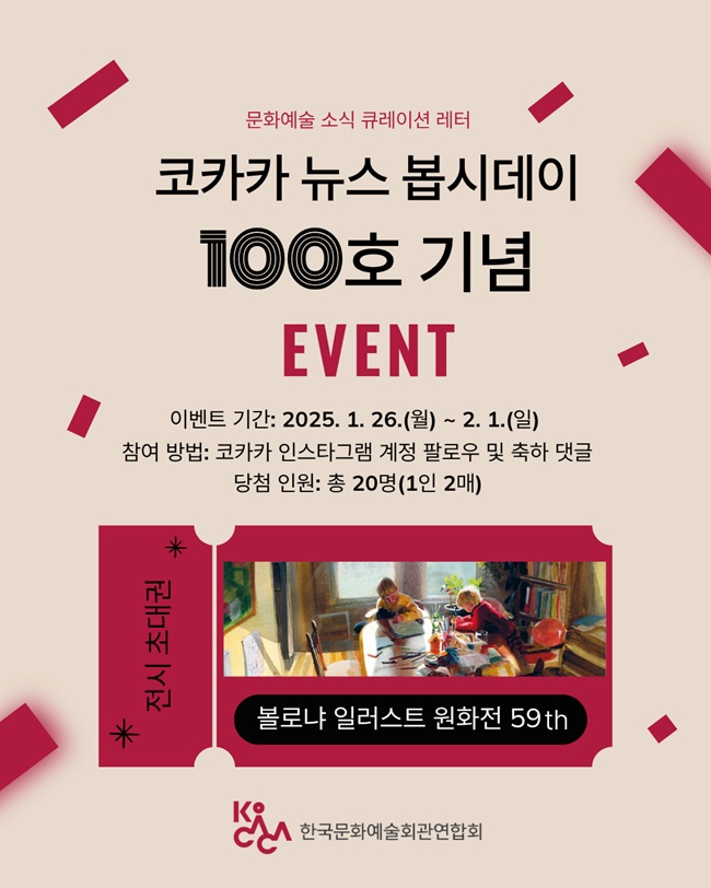 ![]() 전국 문예회관의 현장을 기록해온 <코카카 뉴스 봅시데이>가 어느덧 100호를 맞이했습니다! 이를 기념해 <볼로냐 일러스트 원화전 59th> 초대권 증정 이벤트를 진행합니다. 지금 참여하고 전시 초대권의 주인공이 되어 보세요! 이벤트 혜택 - 당첨 인원: 총 20명 - 증정 혜택: <볼로냐 일러스트 원화전 59th> 초대권(1인 2매) 참여 방법 ① 코카카 인스타그램 계정 팔로우 @kocaca_official ② 이벤트 게시물에 “코카카 뉴스 봅시데이 100호 축하 메시지” 댓글 남기기 * 이벤트 기간 중 팔로우한 계정에 한해 당첨자 선정 이벤트 일정 - 참여 기간: 2026년 1월 26일(월) ~ 2월 1일(일) - 당첨자 발표: 2026년 2월 6일(금) 예정 / 개별 DM 안내 유의사항 • 당첨자 선물 증정을 위해 개인정보 수집 및 활용 동의를 요청할 수 있습니다. • 이벤트 당첨자 발표일 전 팔로우 취소 및 댓글 삭제 시 당첨이 취소될 수 있습니다. • 비공개 계정, 삭제된 계정 등은 당첨에 제한이 있을 수 있습니다. • 중복 당첨자, DM 미응답자 등은 당첨이 취소될 수 있습니다. • 경품은 우편 발송되며, 우편물 분실에 대한 책임을 지지 않습니다. • 본 이벤트에 대한 세부 사항은 주최측의 사정에 따라 변경될 수 있습니다.