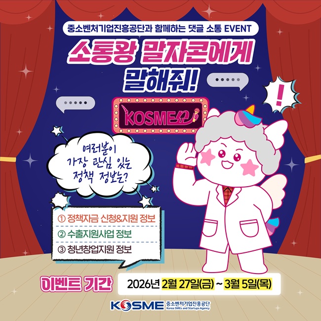 참여방법 1. 중진공 인스타그램(@kosme_official) 팔로우 2. 게시글 좋아요️ / 가장 관심 있는 정책 정보 댓글 작성 ex. 1번, 정책자금 관련 정보요! 3. 내가 작성한 댓글 캡쳐 4. 프로필 하단 링크 접속 후 ⭐네이버 폼⭐ 작성 및 제출