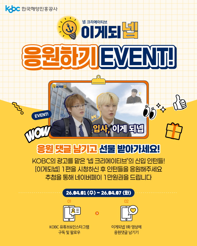 한국해양진흥공사 유튜브와 인스타그램 채널 구독(팔로우)과 이게되넵 1화에서 '넵 크리에이티브' 인턴으로 입사한 우진, 성운에게 응원의 말을 댓글로 남겨주세요! 댓글을 남겨주신 분들 중 추첨을 통해 총 10분께 선물을 드립니다.