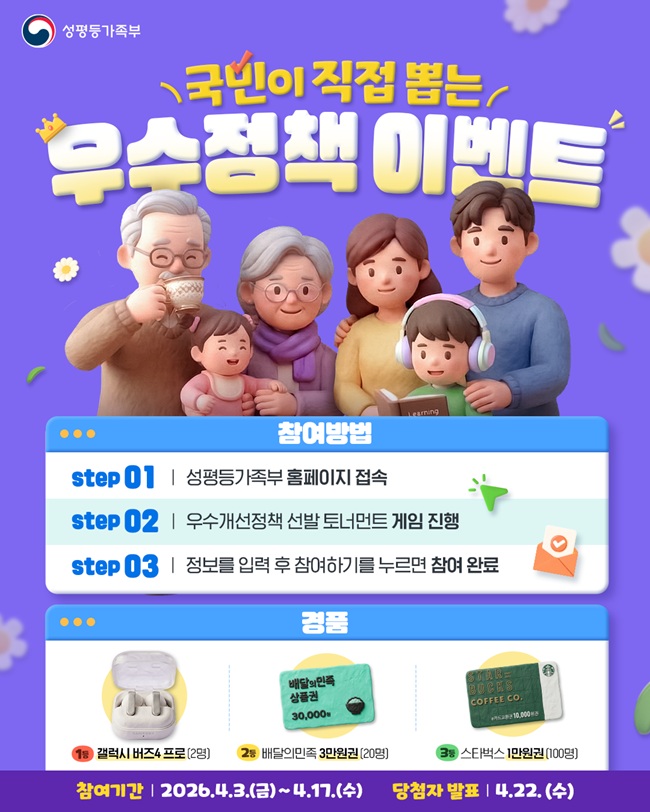 ■ 이벤트 상세 안내 참여 기간: 2026. 4. 3.(금) ~ 4. 17.(금) 당첨자 발표: 2026. 4. 22.(수) 참여 대상: 대한민국 국민 누구나!