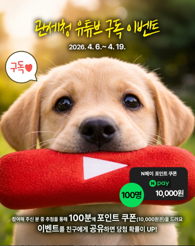 - 이벤트 기간 : 2026.4.6.(월)~4.19.(일) - 당첨자 발표 : 2026.4.23.(목) * 관세청 유튜브 게시물 및 인스타그램 프로필 링크에서 확인하기 - 이벤트 경품 : 네이버페이 포인트 1만 원 (100명)