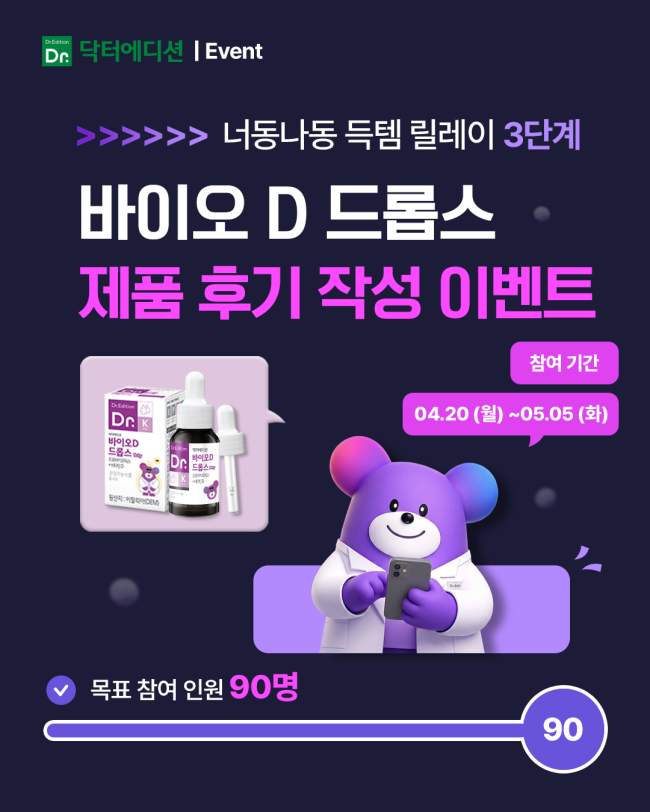 이벤트 참여 방법 (필독!⭐) 1️⃣#닥터에디션 인스타그램 팔로우 2️⃣ 전체 공개된 개인 SNS(인스타그램 피드/릴스, 스레드, 네이버 블로그, 유튜브)에 바이오 D 드롭스 후기 남기기 (필수 해시태그 포함!) 3️⃣ 프로필 링크 신청서 작성하면 참여 완료! ️ 후기 작성만 하면 당첨 제외되니 꼭 신청서를 제출해 주세요!