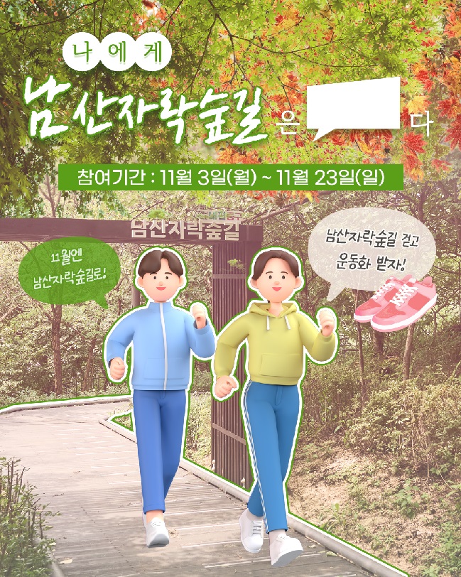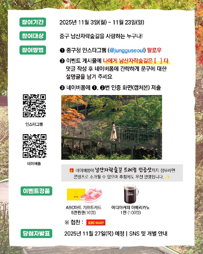 ![]() ![]() 걷기 좋은 11월엔 남산자락숲길로 함께 떠나볼까요?️ “나에게 남산자락숲길은 ○○다” 여러분이 느낀 남산자락숲길의 의미를 이벤트 게시물에 댓글로 남겨주세요! 🥰 댓글만 달아도 운동화·커피 선물이 기다리고 있어요 (𝗧𝗜𝗣. 네이버폼에 ’남산자락숲길 트레킹 인증샷‘을 올리면 당첨확률 𝙐𝙋🩷) 참여방법 ① 중구 공식 인스타그램(@jungguseoul) 팔로우 ② 이벤트 게시물에 나에게 남산자락숲길은 [ ]다 댓글 작성 후 캡처 - 네이버폼에 간략하게 문구에 대한 설명글을 남겨 주세요 ③ 네이버폼에 ①, ②번 인증 화면(캡처본) 제출 - 네이버폼 링크는 @jungguseoul 프로필 하이라이트에서 확인! https://naver.me/x1mP0wNS 🧸 이벤트 참여 Tip 네이버폼에 남산자락숲길 트레킹 인증샷까지 첨부하면 콘텐츠로 소개될 수 있으며 추첨에도 우선 반영됩니다. 이벤트 기간: 2025년 11월 3일(월)~11월 23일(일) 당첨자 발표: 2025년 11월 27일(목) / SNS 및 개별 안내 이벤트 경품 - ABC마트 기프트카드 5만원권(10명) 당초 안내드렸던 운동화 1족(5명) 대신, ABC마트 기프트카드 5만원권(10명)으로 변경되었습니다! 내부 사정에 따라 조정된 점 양해 부탁드리며, 원하는 제품을 자유롭게 고를 수 있다는 장점도 있어요 ※협찬: ABC마트 - 이디야 아메리카노 1잔(100명) 유의사항 ※ 기프트카드 당첨자께는 개별 연락을 통해 우편 정보 확인 후 발송됩니다 ※ 이벤트 참여 후 팔로우를 취소하면 당첨이 취소될 수 있습니다 ※ 본 이벤트는 인스타그램 전용 이벤트로, 인스타그램 이외의 참여는 인정되지 않습니다 ※ 중복 참여는 가능하나, 개인정보 기준 1인 1당첨을 원칙으로 합니다 ※ 이벤트 및 경품 내용은 내부사정에 따라 일부 변경될 수 있습니다 ※ 잘못된 정보 입력으로 인한 상품 미지급은 중구에서 책임지지 않습니다