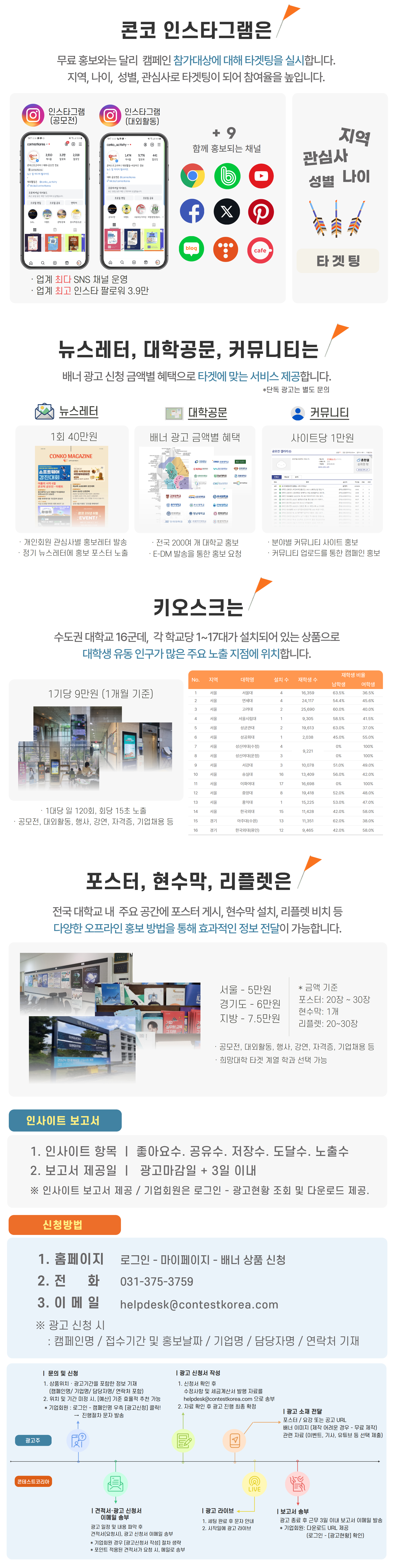 ① 1회 40만원(VAT별도) * 추가 시 회당 15만원 ② (선택사항) 인스타 스폰서 광고 * 인스타그램 플랫폼에 타겟팅 유료 광고 * 타겟팅: 나이/ 지역/ 관심사 맟춤 광고 * 통상 30만원 ~ 100만원 진행 |