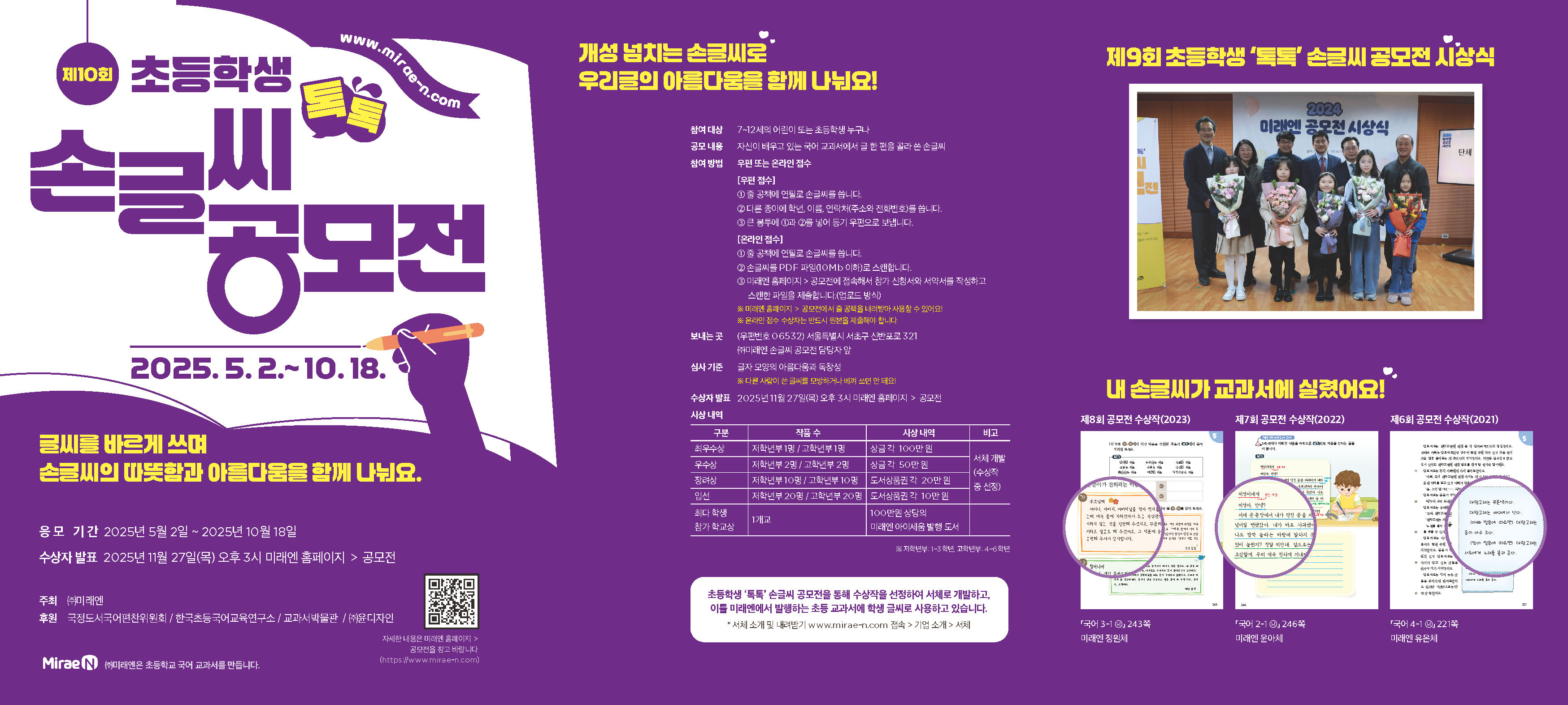 초등학교 교과서에 활용할 수 있는 손글씨를 개발하기 위해 <미래엔>에서 2016년부터 매년 시행하는 공모전이에요!