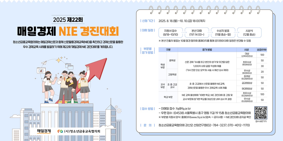 청소년금융교육협의회는 매일경제신문과 함께 신문활용경제교육(NIE)을 촉진하고 경제신문을 활용한 우수 경제교육 사례를 발굴하기 위해 제22회 매일경제 NIE 경진대회를 개최합니다.