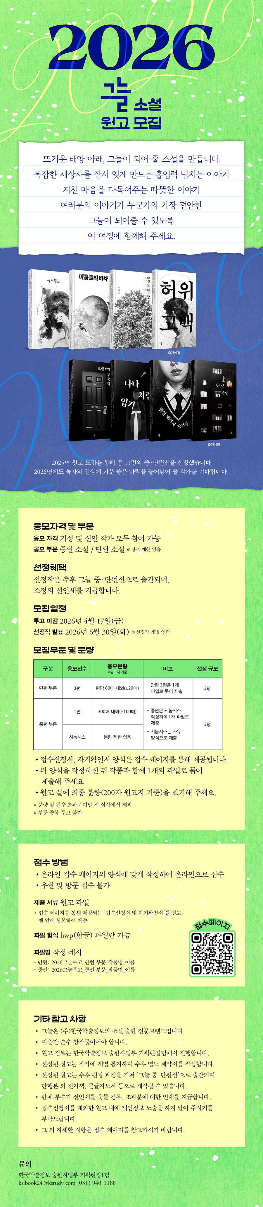 뜨거운 태양 아래, 그늘이 되어 줄 소설을 만듭니다. 복잡한 세상사를 잠시 잊게 만드는 흡입력 넘치는 이야기, 지친 마음을 다독여주는 따뜻한 이야기. 여러분의 이야기가 누군가의 가장 편안한 그늘이 되어줄 수 있도록 이 여정에 함께해 주세요.