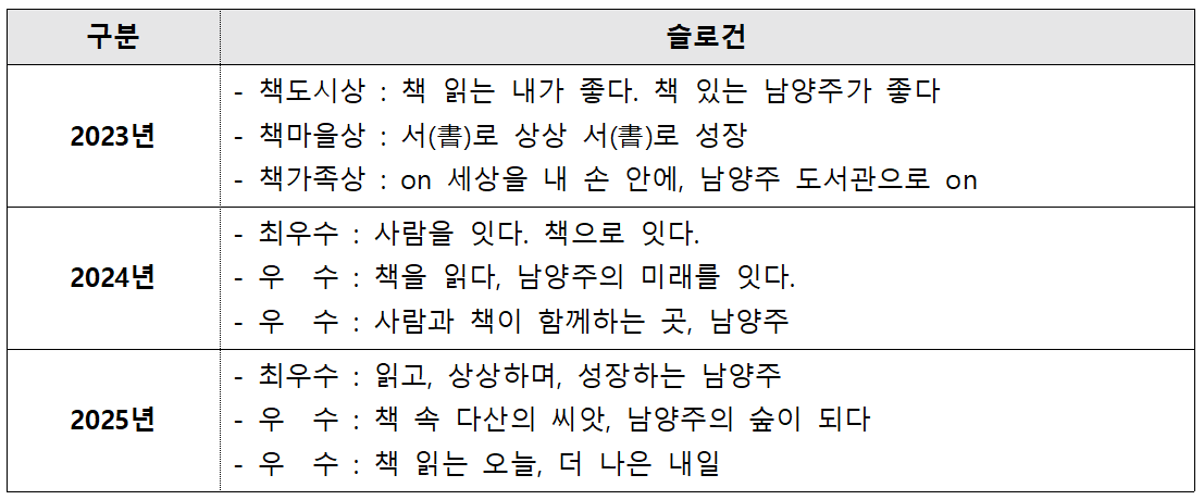 ※ 남양주시 도서관 슬로건 공모전 우수작 예시('23~'25) 참고 (하단 이미지)
