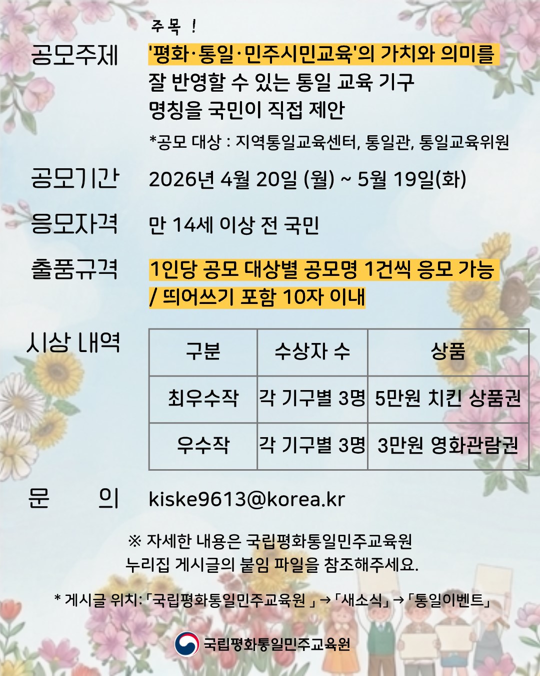 '지역통일교육센터, 통일관, 통일교육위원'의 새로운 이름을 각각 지어주세요!