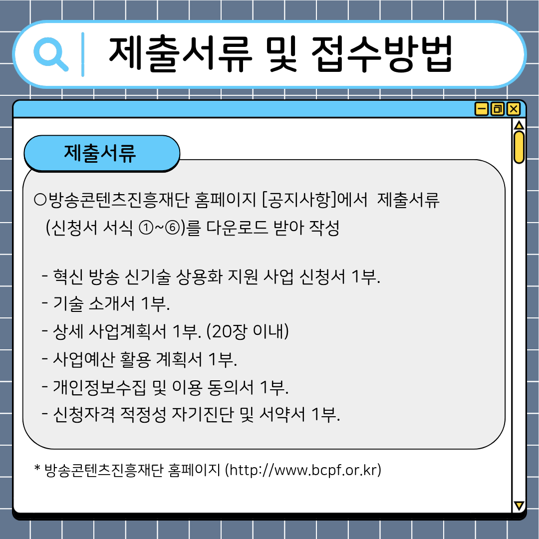 - 혁신 방송 신기술 사용화 지원 사업 신청서 1부.