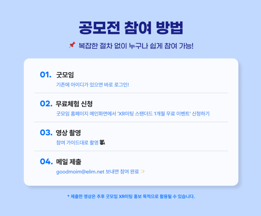 * 제출한 영상은 추후 굿모임 XR미팅 홍보 목적으로 활용될 수 있습니다.